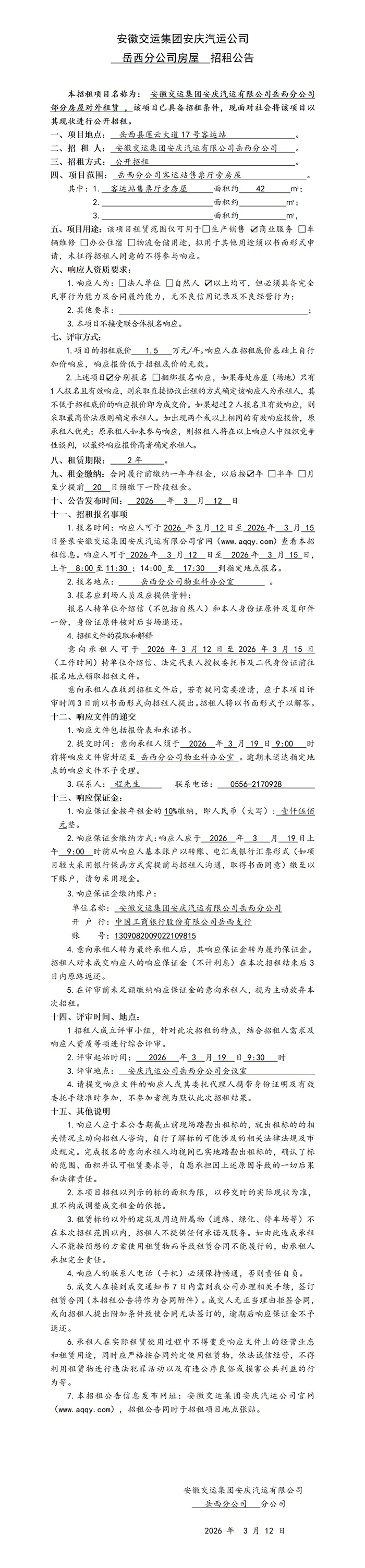 岳西分公司部分房屋對外租賃公告