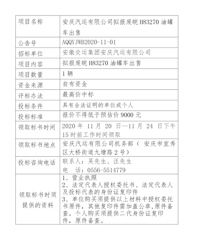 安慶汽運(yùn)公司擬報(bào)廢皖H83270油罐車售公告