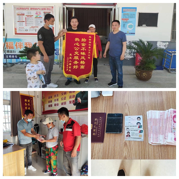 事情是這樣的,2022年6月4日下午,宿松城市5路公交車到終點站,駕駛員黎石保在乘客下車后對車輛進(jìn)行清潔消毒時,突然發(fā)現(xiàn)車廂座位上有一個黃色布袋。打開一看布袋里有個黑色皮包,皮包內(nèi)有現(xiàn)金、身份證、社保卡等。黎石保原地等待一段時間,失主一直沒有出現(xiàn)。公交班車回站后,依照公司相關(guān)管理規(guī)定,黎石保第一時間將布袋上交公司。經(jīng)工作人員清點,內(nèi)有現(xiàn)金4700元,2張身份證、2張社?,以及一本存款1.6萬的存折。