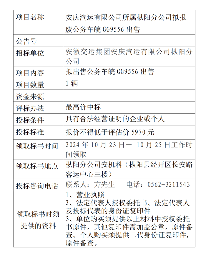 樅陽分公司擬報廢公務車皖GG9556出售公告
