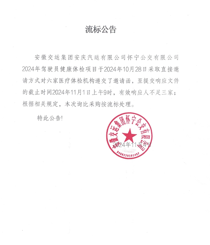 懷寧公交公司2024年駕駛員健康體檢項目流標(biāo)公告